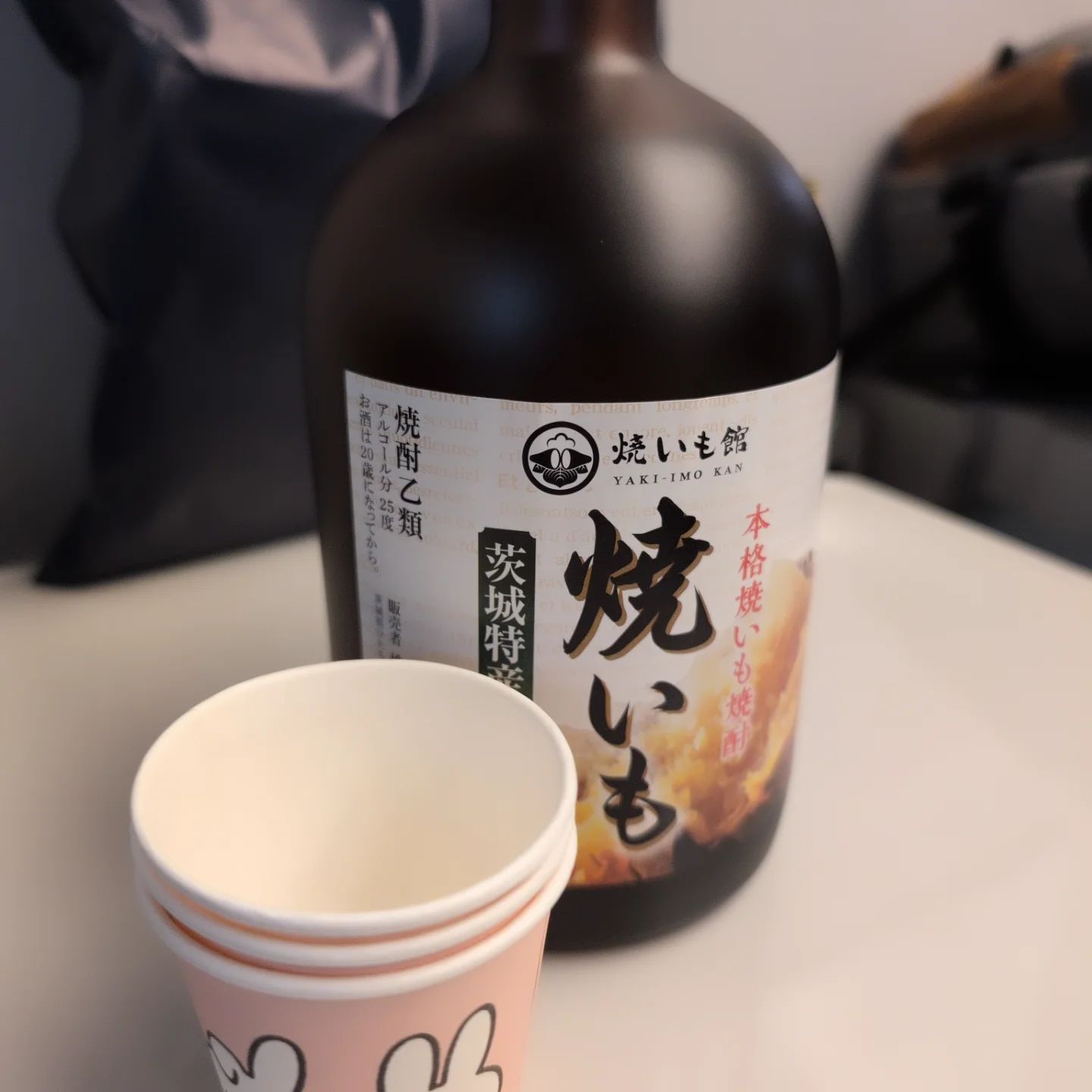 てなことで、新幹線の中で焼き芋焼酎を飲む三名。