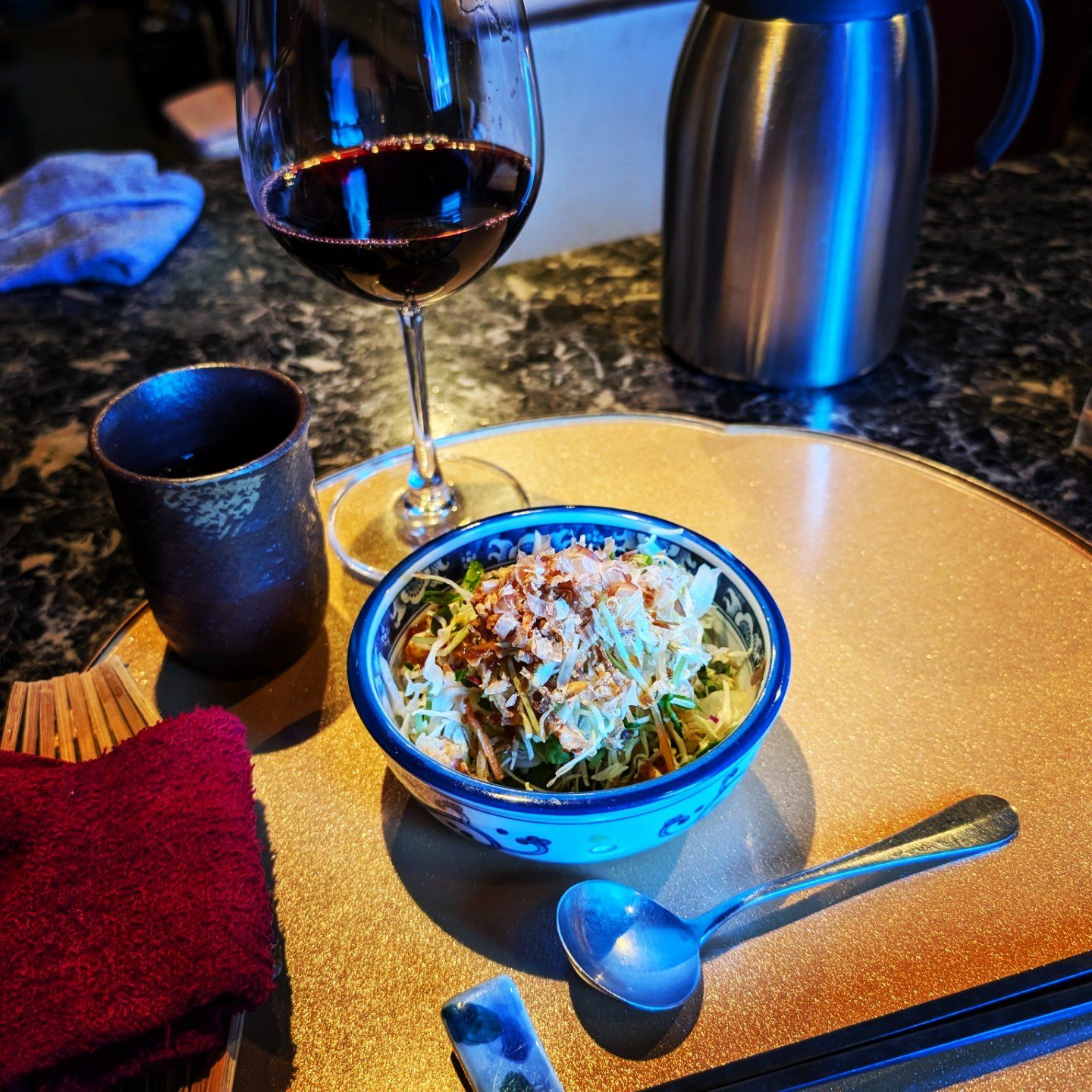 もうサラダから最高すぎるし、ドリンクは一杯ついているのでワインを注文。