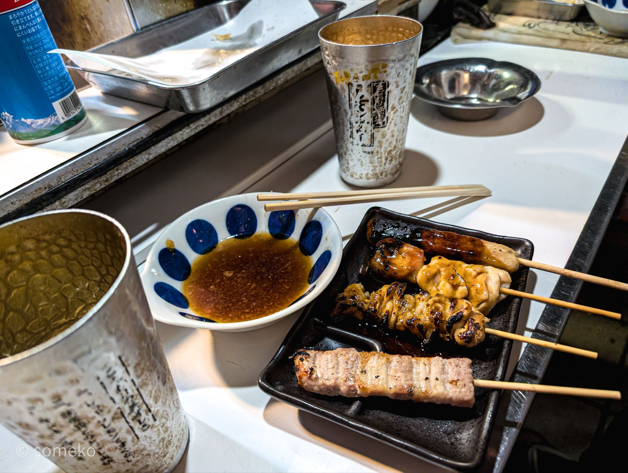 適当にあいてる屋台に入って、軽く焼き鳥食べてレモンサワー飲みました。